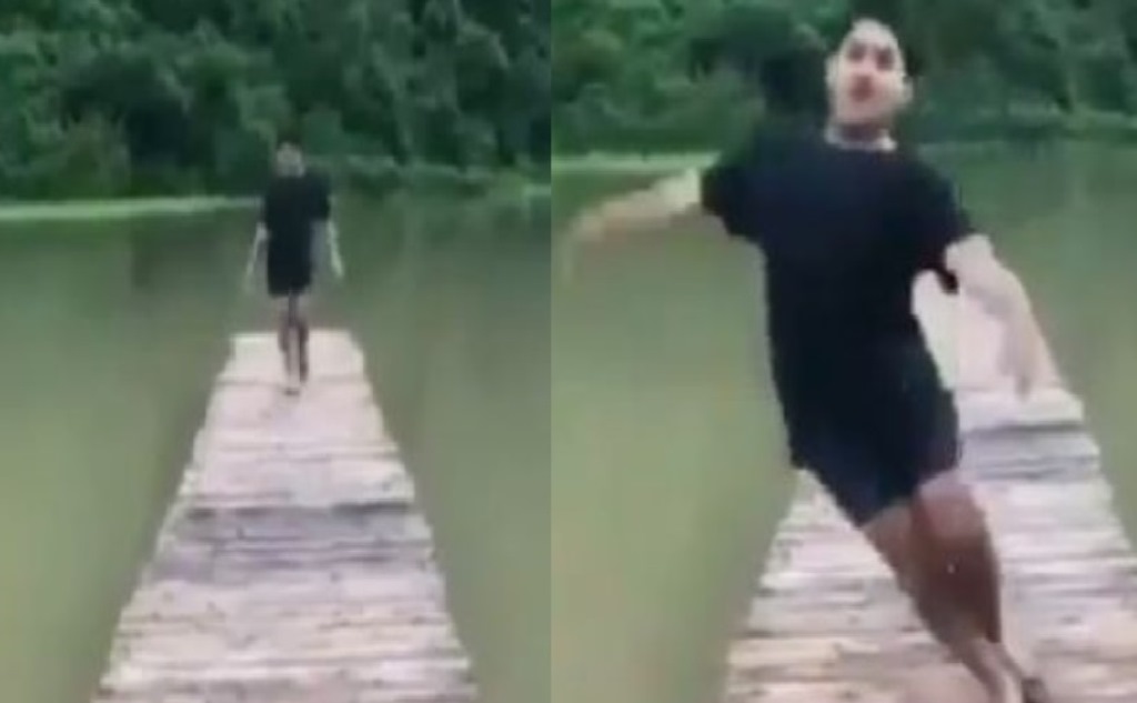 Saat sedang beraksi, ia justru tercebur ke dalam sungai. Bukan hanya netizen yang terbahak-bahak, namun seseorang yang merekamnya pun tidak bisa menahan tawanya melihat aksi gagal temannya tersebut.