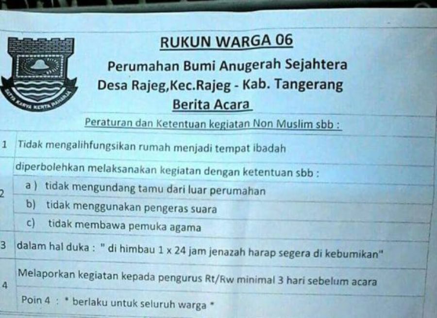 Surat pembatasan kegiatan keagamaan tersebut ditujukan bagi warga Non Muslim yang berada di Perumahan Bumi Anugerah Sejahtera RW 06 Desa Rajeg, Kecamatan Rajeg, Kabupaten Tangerang.