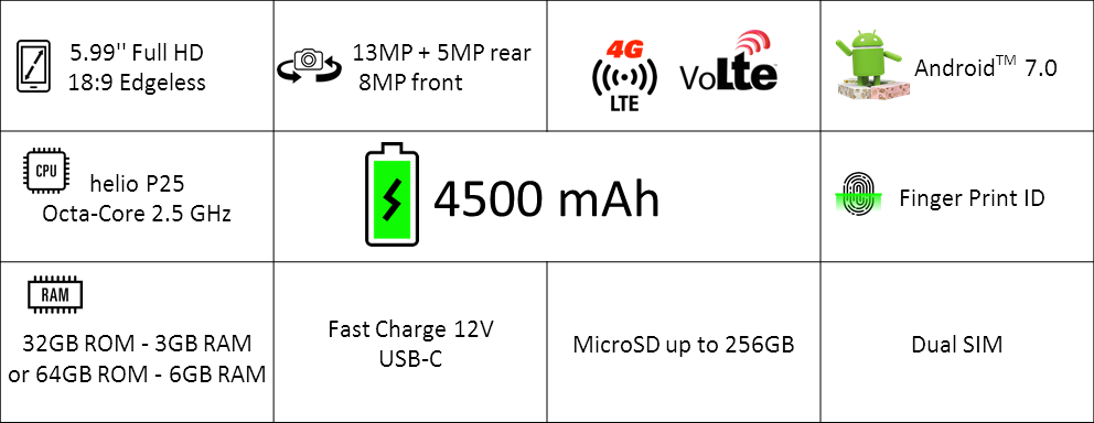 Spesifikasi Energizer Power Max P600S meliputi chipset octa-core 2.5 GHz Mediatek Helio P25, dua pilihan RAM 3GB/6GB, dan dua pilihan kapasitas memori internal 32GB/64GB.