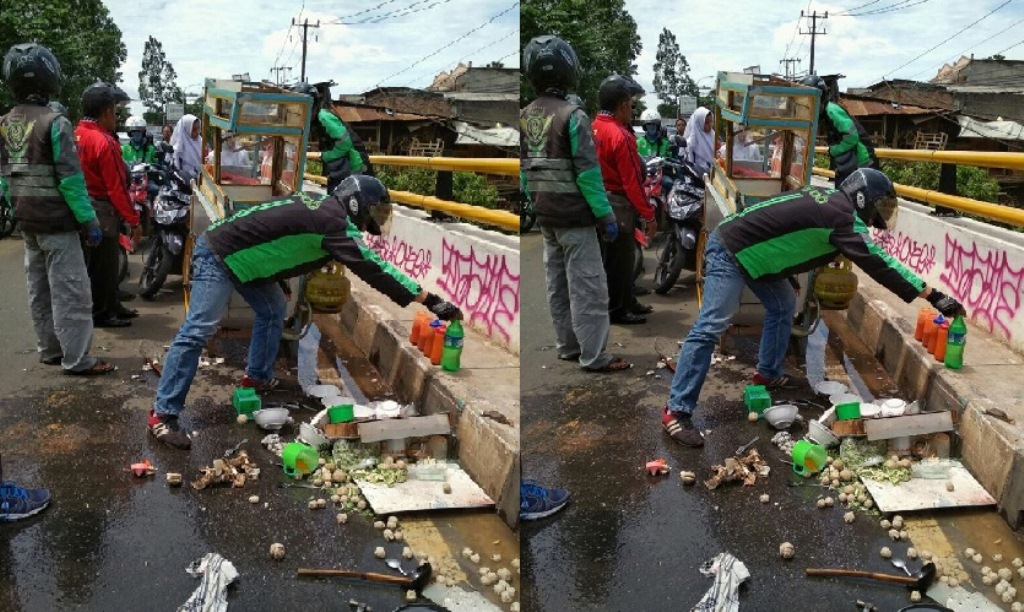 Saat saya tiba di situ, si abang bakso sedang ditolongin oleh mas-mas ojek online.