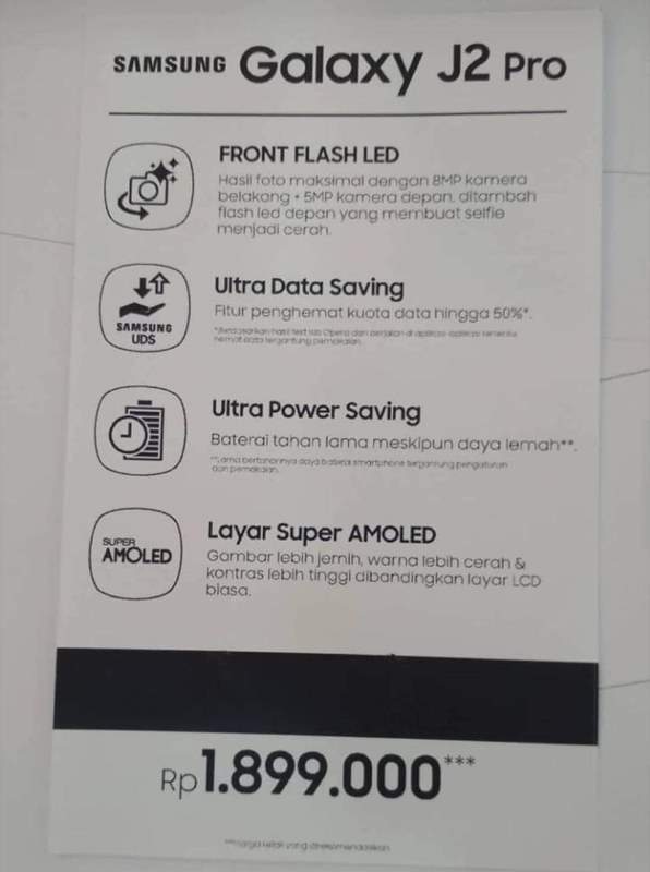 Dalam foto bocoran leaflet terungkap berapa banderol harga retail yang direkomendasikan untuk perangkat anyar Galaxy J2 Pro (Samsung SM-J250F) di Indonesia, yakni dilego Rp 1.899.000.