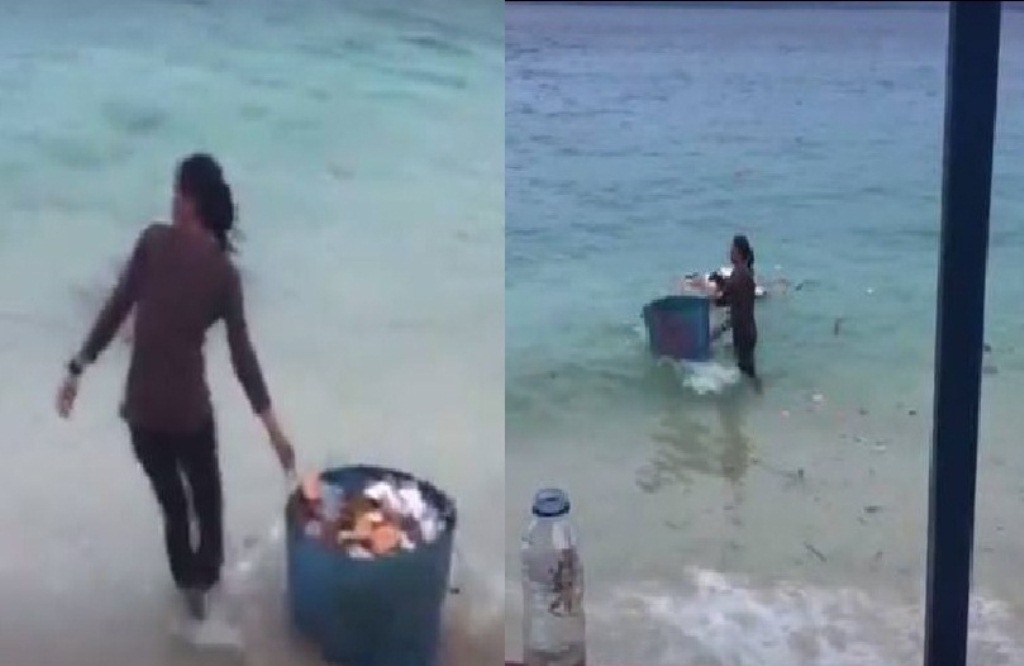 Tampak ada rasa bersalah atau ragu lagi, wanita tersebut menumpahkan satu tong sampah tersebut ke laut.