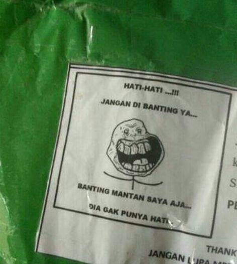 Di setiap bungkusan atau kemasan barang yang mudah pecah biasanya selalu disertakan tulisan “jangan dibanting’. Tapi penjual yang satu ini pesannya ditambah dengan kata-kata menohok para pasukan gagal move on.