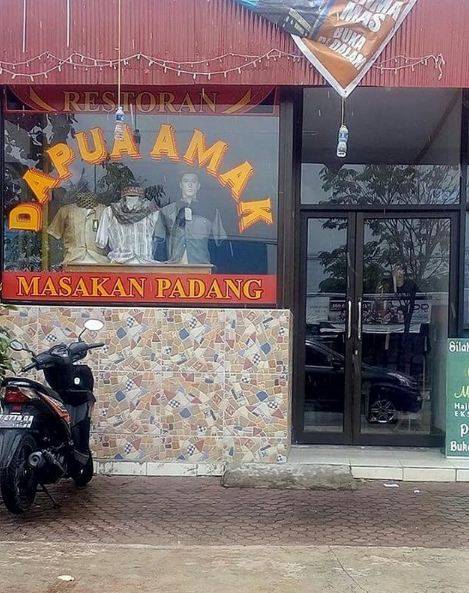 Kalau yang satu ini dijamin bikin calon pembeli bingung. Tulisannya sih jualan masakan padang, tapi yang dipajang kok pakaian, bingung gak sih?