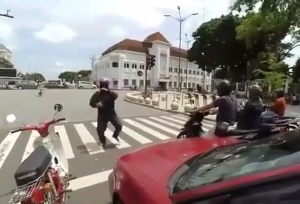 Semetara motornya ia biarkan tidak melalui batas garis putih di traffic light. Aksinya ini menarik perhatian pengendara lain hingga ada yang merekamnya.