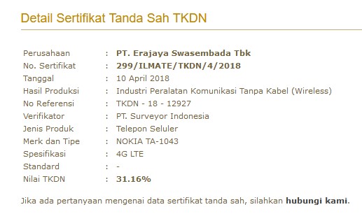 Menurut situs TKDN, ponsel Nokia TA-1043 yang diajukan oleh PT. Erajaya Swasembada Tbk itu telah mengantongi sertifikat dengan nomor 299/ILMATE/TKDN/4/2018 tertanggal 10 April 2018.