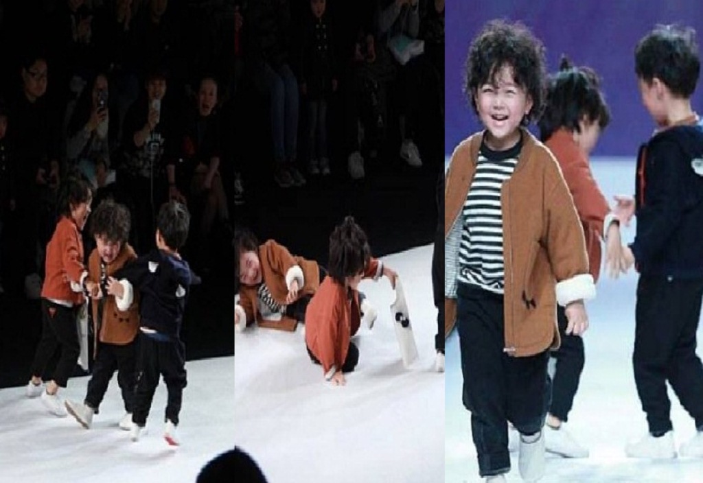 Namun ditengah aksinya ini ia sempat terjatuh karena bertabrakan dengan dua model cilik yang lainnya.