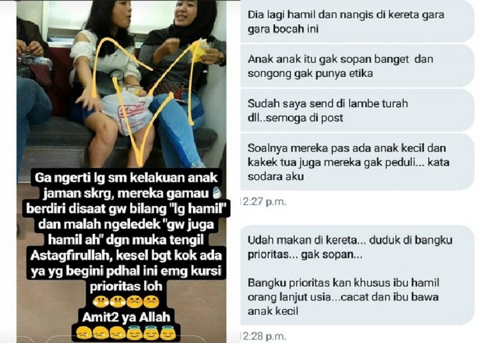 Temannya ini mempunyai saudara tang tengah mengandung. Ketika ia menaiki KRL jurusan Bogor-Kota, ia akan duduk dan meminta kursi prioritas pada kedua remaja yang duduk disana.