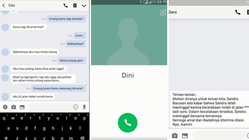 Tiba-tiba saja muncul notifikasi pesan dari seseorang bernama Beni. Ia mengabarkan bahwa Sandra dan temannya meninggal akibat kecelakaan mobil.