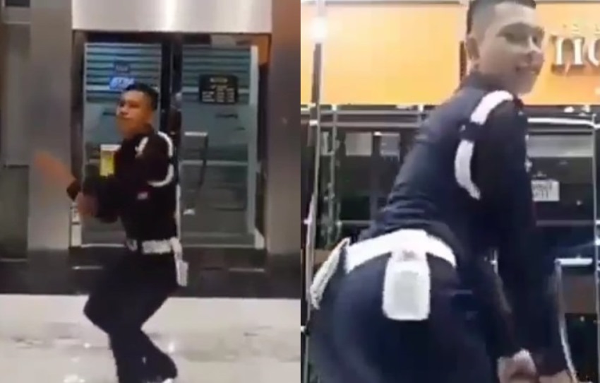 Di video lainnya, tampak satpam yang sama awalnya berdiri tegak sambil menengok kanan kiri. Kemudian ia pun mengangkat satu celananya dan langsung menari dengan begitu luwesnya.