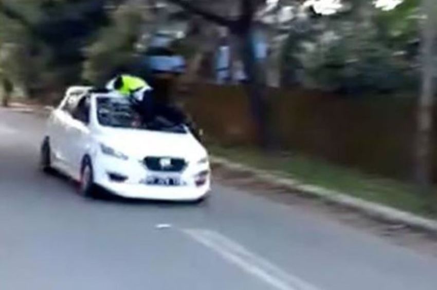 Mobil tersebut tampak melaju dengan cepat dan berjalan berzig-zag seperti hendak menjatuhkan polisi tersebut dari atas mobil.