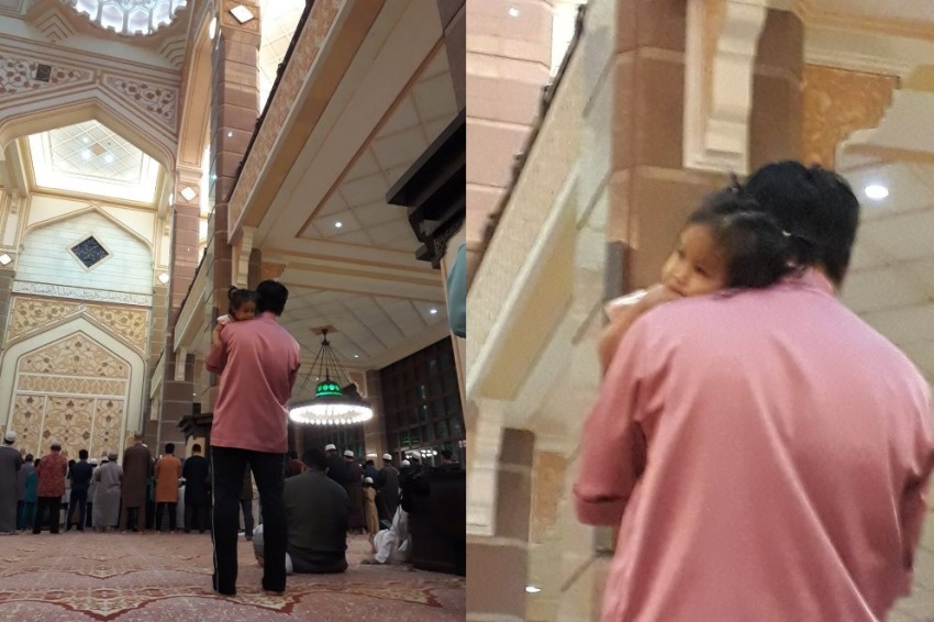 Pria berbaju pink itu terlihat shalat sambil menggendong anak perempuannya. Gadis kecil yang tadinya menangis pun seketika langsung diam.