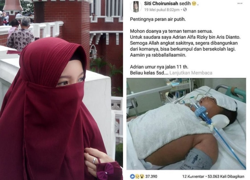 Dalam postingannya itu Siti mengunggah sebuah foto adiknya yang sudah terbaring kritis di kasur rumah sakit dengan sejumlah selang yang dipasang dibadan sang adik.