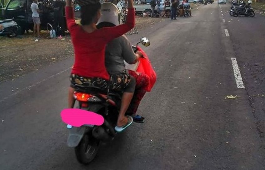 Hal itu karena akun tersebut mengunggah sebuah foto yang memperlihatkan seorang wanita berbaju merah lengan panjang yang sedang dibonceng motor.