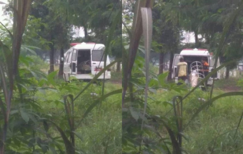 Dalam foto-foto yang diunggahnya itu menunjukkan dua orang pria menggotong jenazah keluar dari mobil ambulan berplat merah.