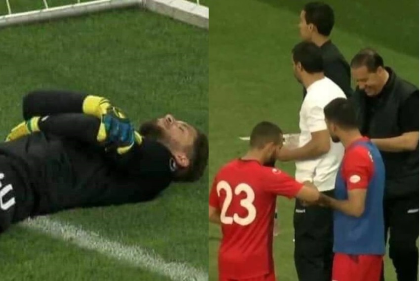 Dalam foto yang beredar di media sosial, selagi sang kiper tergeletak, tampak para rekan satu timnya menuju ke tepi lapangan untuk minum air dan memakan kurma.