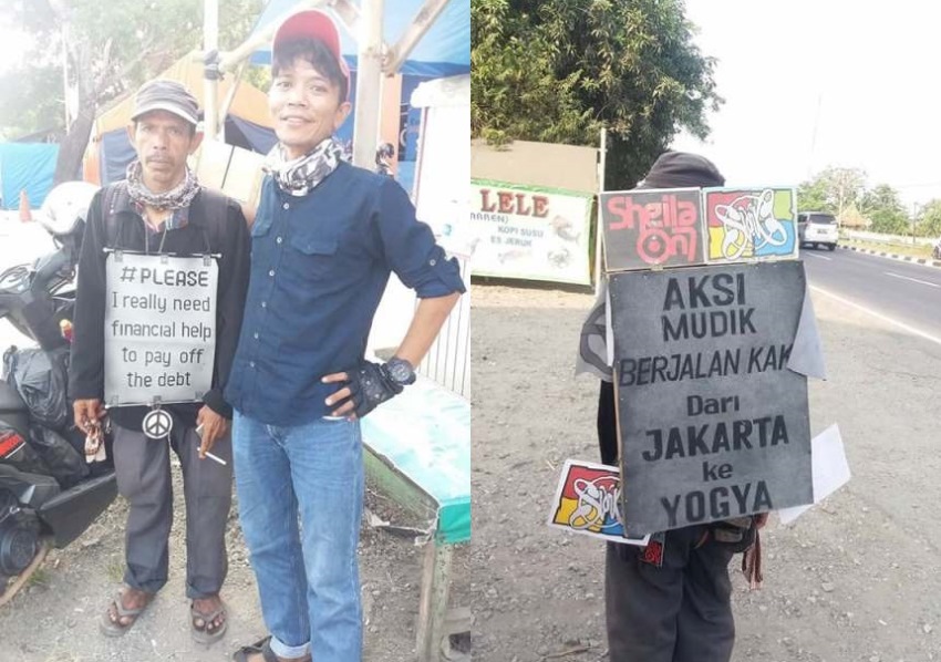 Sementara itu di punggungnya juga ada tulisan, “Aksi mudik berjalan kaki dari Jakarta ke Yogya.” Selain itu ada logo dua band yang terpasang di barang bawaannya. Logo tersebut merupakan logo Slank dan Sheila On 7.