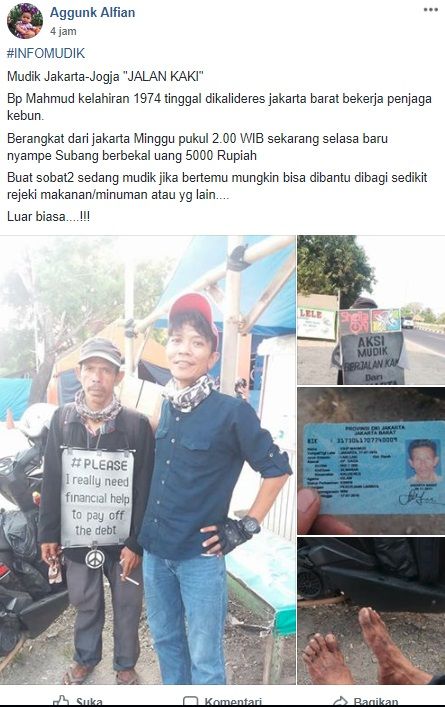 Aggunk juga mengunggah foto sosok Mahmud yang mudik dengan berjalan kaki. Pria itu tampak hanya menggunakan sandal jepit sebagai alas kakinya.