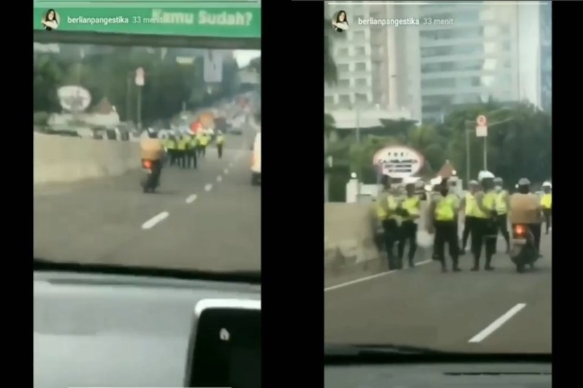 Dalam video itu tampak seorang pemotor yang memakai jaket warna coklat melintas di JLNT Casablanca. Dan di depannya nampak gerombolan polisi yang sedang berjaga.