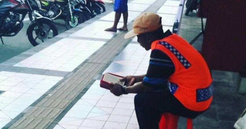 Tapi kali ini berbeda dari biasanya, seorang tukang parkir di Klaten, Jawa Tengah lebih memilih untuk menggunakan waktu luangnya dengan membaca Al-Quran.