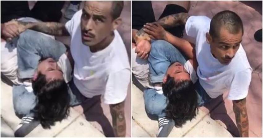 Nggak perlu waktu lama, atlet MMA itu pun langsung menangkap dan memberikannya jurus kuncian bela diri dengan cara mengapit serta mencekik leher penjahat tersebut.