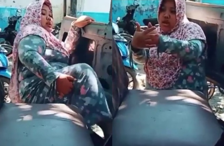 Dalam video itu tampak seorang emak-emak memakai daster motif bunga-bunga turun dari kendaraan yang mirip truk.