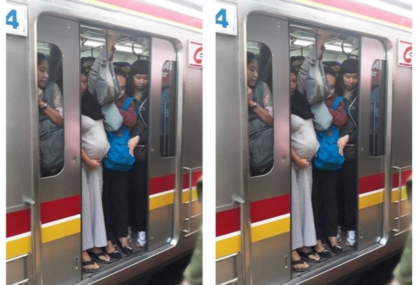 Foto tersebut memperlihatkan seorang ibu hamil yang berdesak-desakan saat naik commuter line. Ibu itu tampak memegangi perutnya dan berdiri di pinggir pintu.