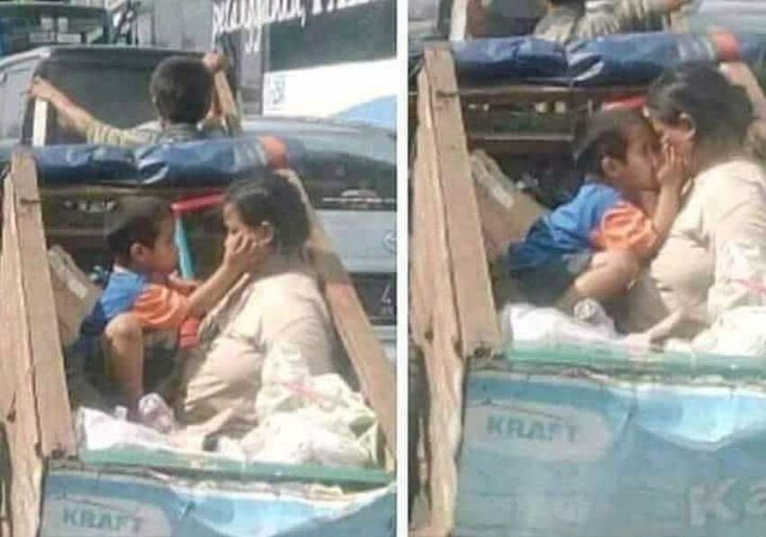 Dalam foto itu terlihat seorang ibu dan anaknya yang tengah berada di dalam sebuah gerobak yang dipenuhi dengan berbagai macam barang.
