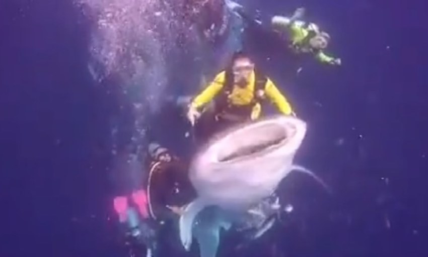 Dalam video itu tampak seorang penyelam berbaju kuning menunggangi hiu paus sambil memberikan simbol ‘OK’ dengan tangannya.