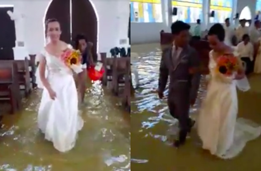 Dua sejoli ini tetap melangsungkan pernikahannya meski banjir merendam lokasi pernikahan mereka.