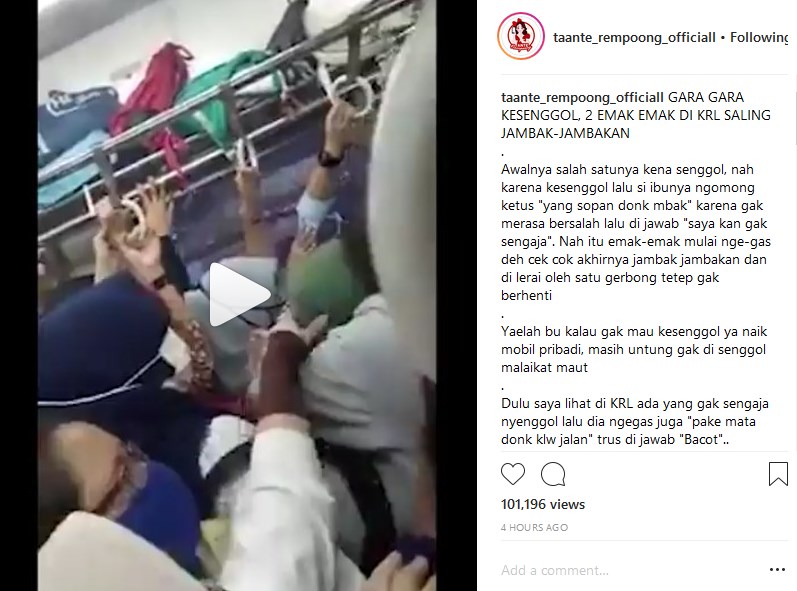 Mungkin karena kondisi kereta yang sedang penuh, emosi keduanya pun tersulut hingga terlibat adu mulut dan saling jambak-jambakan. Meski sudah dilerai oleh satu gerbong, perkelahian keduanya tidak terhentikan.