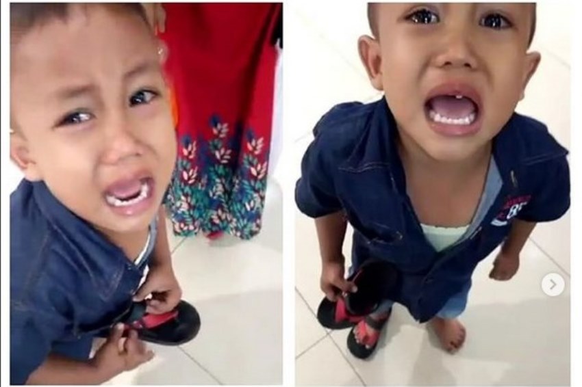 Diketahui, bocah itu menangis karena ia kehilangan satu sandalnya sehingga ia hanya memakai sandal sebelah.