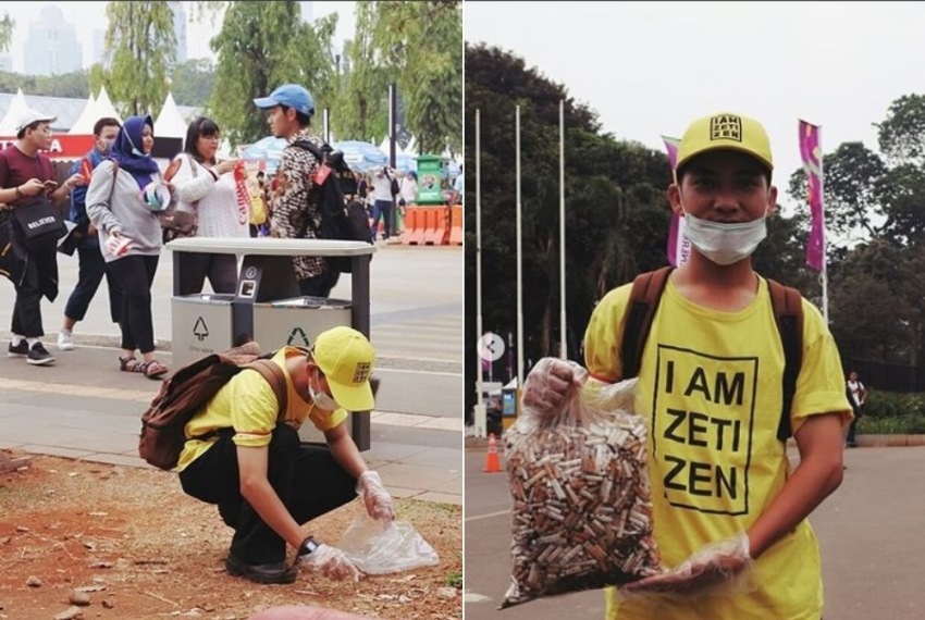 Setiap puntung rokok yang ditemukannya akan ia kumpulkan dan dimasukkan ke dalam plastik. Aksi tersebut dilakukannya seorang diri dari hari pertama hingga Asian Games berakhir.