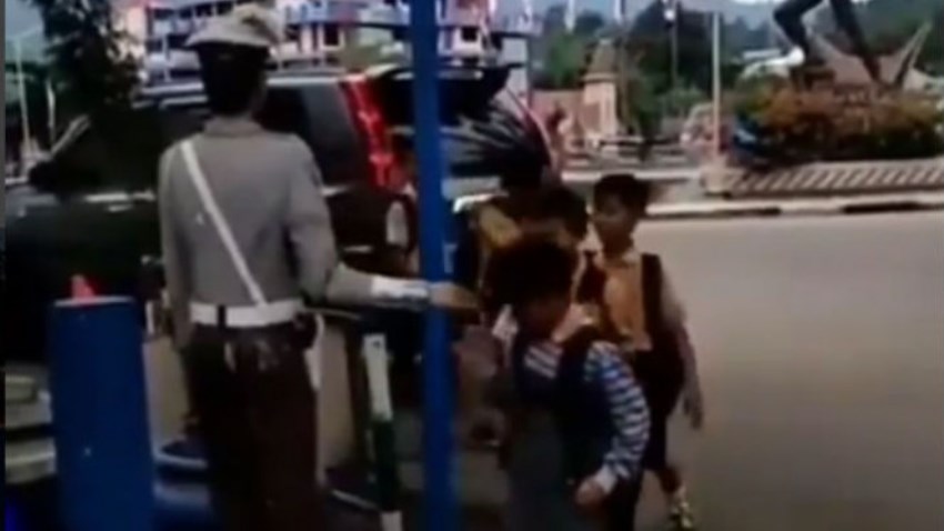 Bocah yang berjumlah delapan orang itu pun langsung menghampiri patung tersebut dan mencium tangan patung polisi itu dengan diawali hormat terlebih dulu.