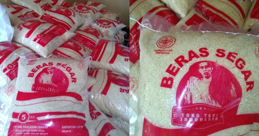 Selain itu, terdapat pula tulisan ‘Beras Segar’ dan ‘Toko Tani Indonesia’ di bagian tengah bungkus beras itu.