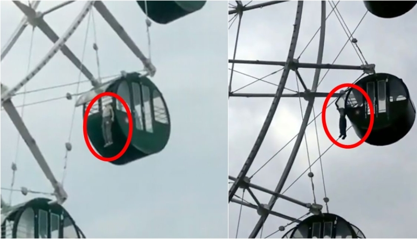 Tak disangka, kakinya terpeleset dan ia pun nyaris jatuh. Kepalanya masih tersangkut di teralis jendela bianglala yang dinaikinya.