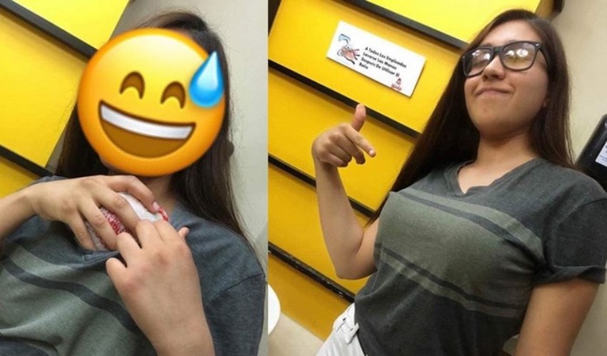Bukan dengan menggunakan tas atau alat penyimpanan lainnya, tapi wanita ini memasukan dua burger itu ke dalam BH-nya.