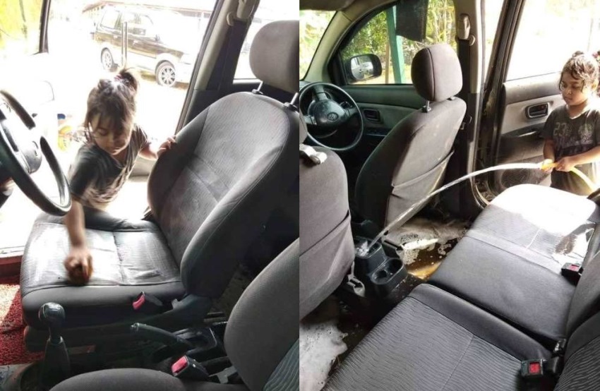 Kocaknya, ide sang anak dalam membersihkan jok mobil itu justru diluar dugaan, Nggak cuma menyiramkan sabun cuci ke permukaan kursi, tapi Nur juga menyiramkan ke bagian-bagian lain mobil.