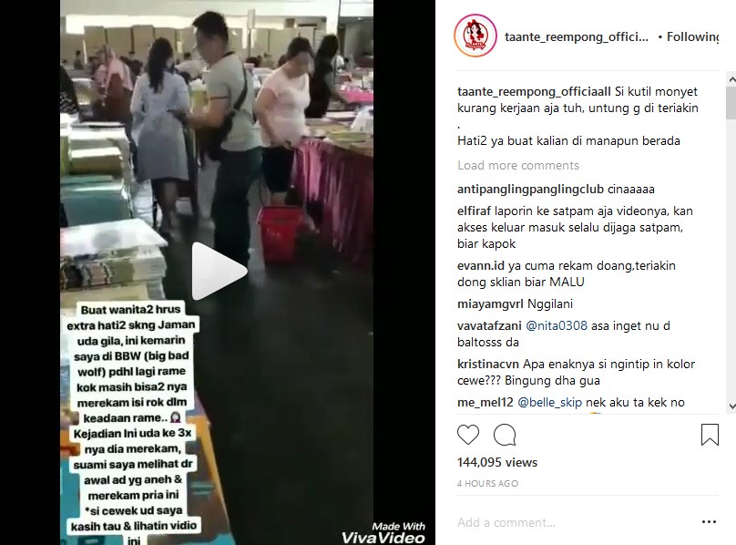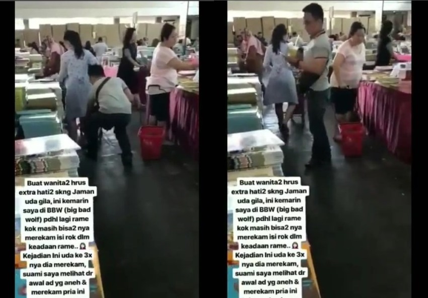 “Buat wanita2 hrus extra hati2 skrng jaman uda gila, ini kemarin saya di BBW (big bad wolf) pdhl lagi rame kok masih bisa2 nya merekam isi rok dlm keadaan rame..