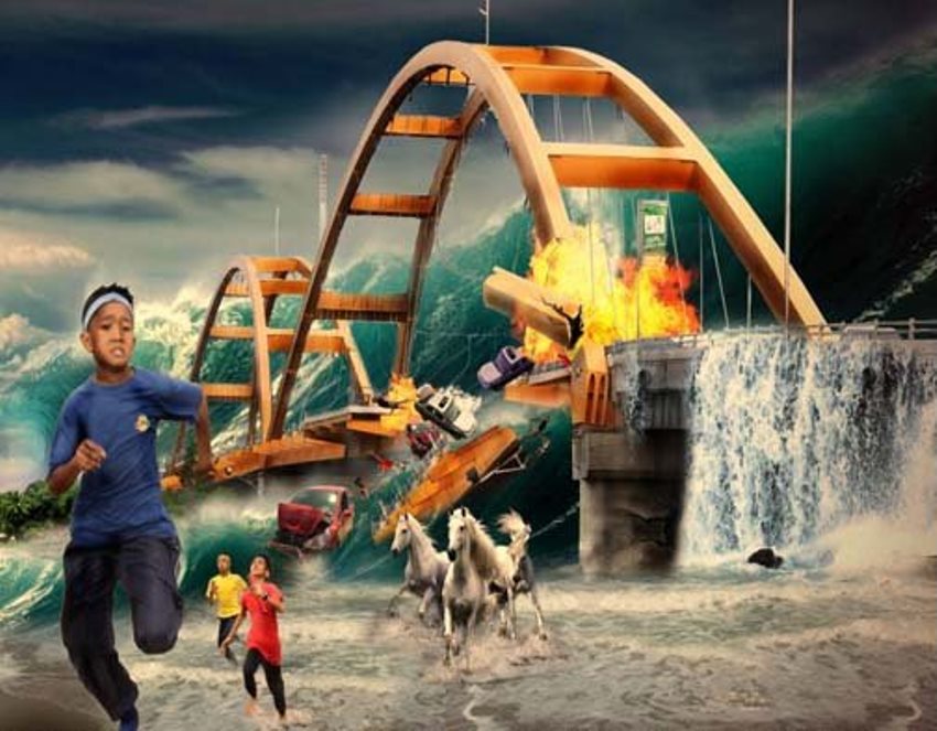Ketiga bocah itu pun berusaha untuk berlari sekencang mungkin demi bisa selamat dari tsunami tanpa melihat ke belakang.