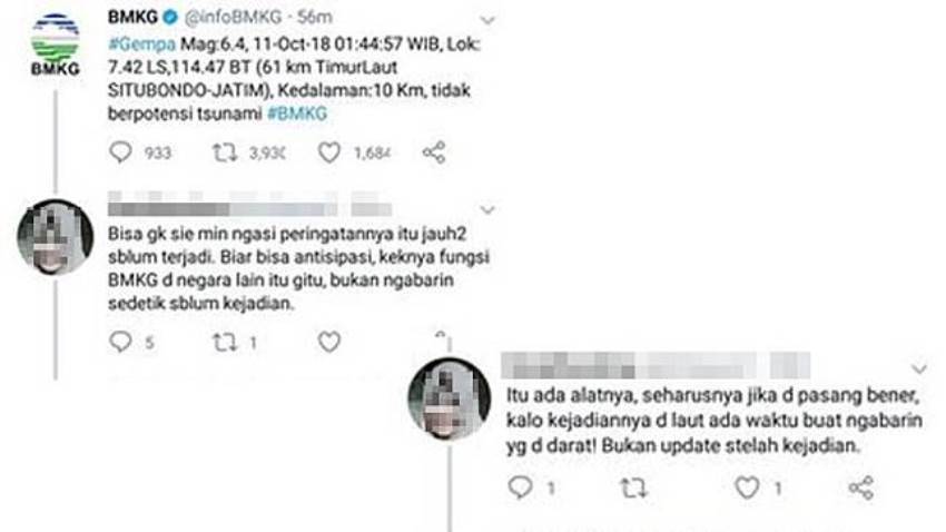 “Bisa gk sie min ngasi peringatannya itu jauh2 sblum terjadi. Biar bisa antisipasi, keknya fungsi BMKG di negara lain gitu, bukan ngabarin sedetik sblum kejadian”, tulis netizen tersebut.