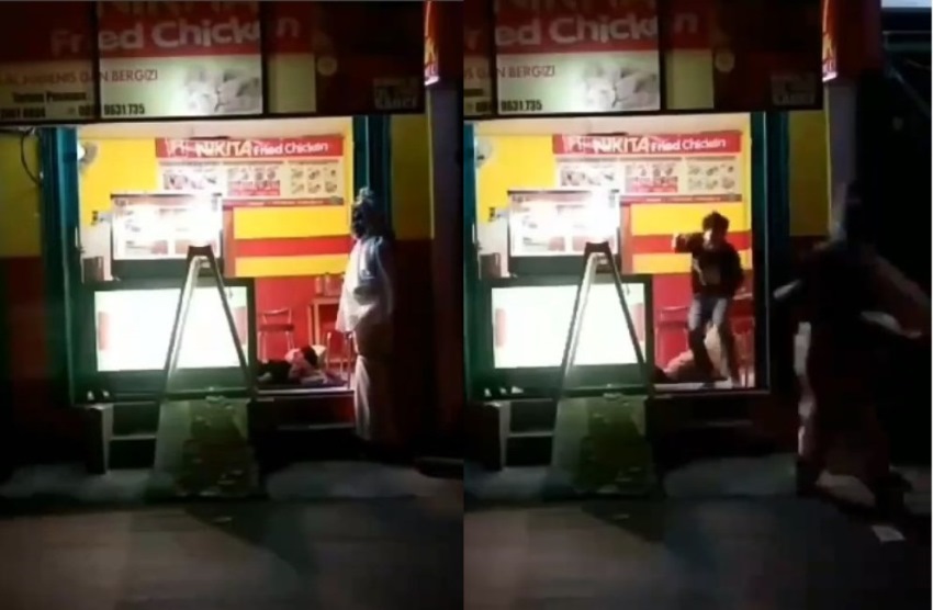 Awalnya, penjaga warung ayam goreng itu sedang tertidur saat menjaga warung di malam hari. Tiba-tiba saja seseorang dengan kostum pocong berdiri di depannya.