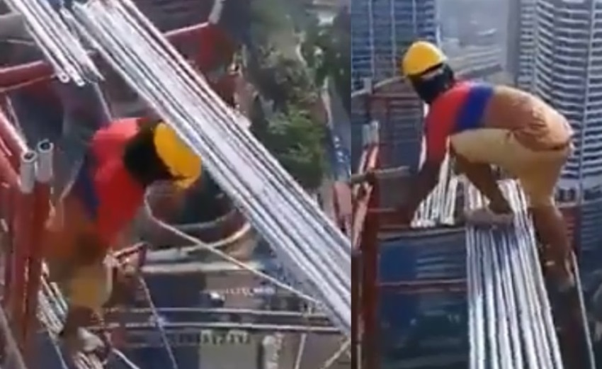 Dalam video yang viral di media sosial ini juga terlihat pekerja laki-laki dengan santai menyusun rangkaian scaffolding. Bahkan tukang bangunan itu hanya berpijak di kumpulan besi-besi panjang berukuran kecil.