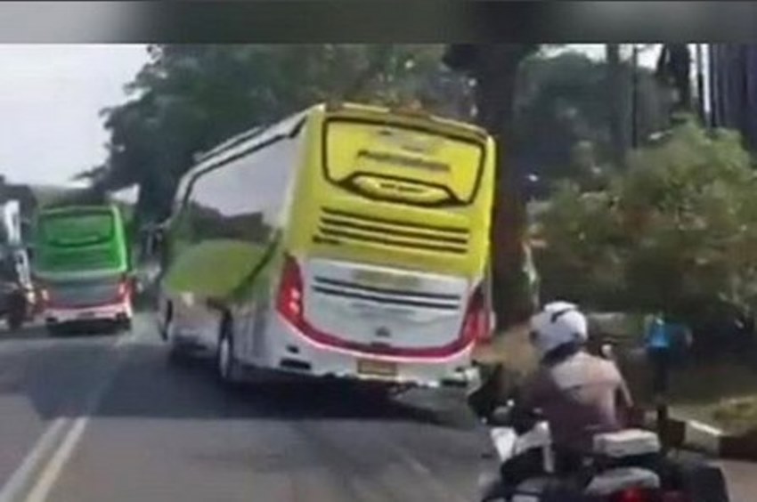 Alhasil, bodi bus itu juga terlihat oleng hingga lajur berlawanan arah. Yang menarik perhatian adalah bahwa ada satu unit motor polantas di belakang bus itu.