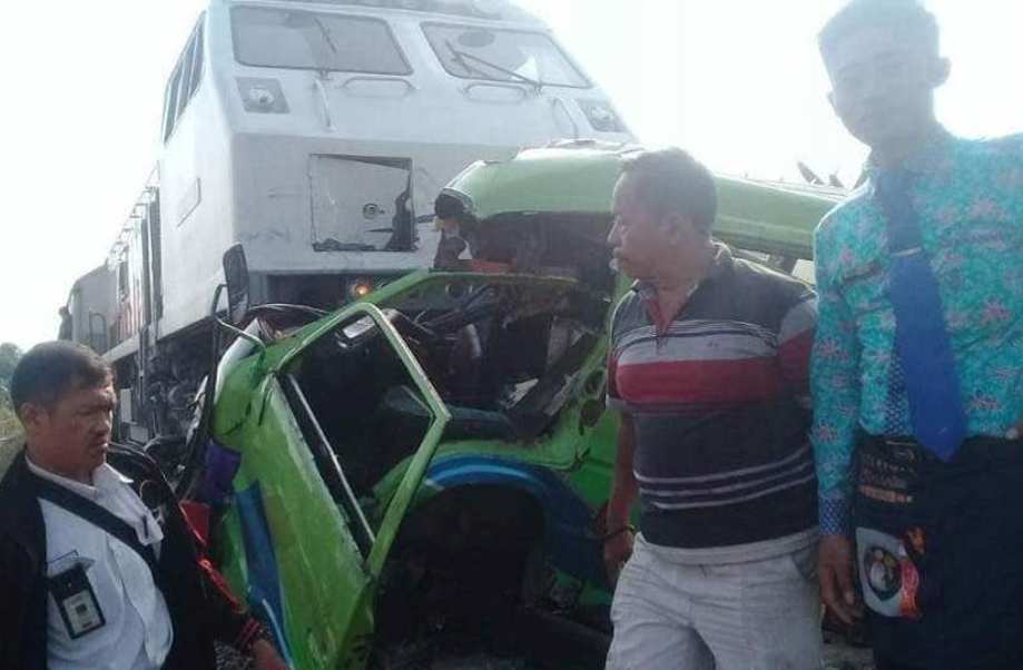 Mobil angkutan umum ini tiba tiba mogok tepat di tengah perlintasan, saat warga hendak mendorong mobil tersebut tiba tiba di saat yang bersamaan ada kereta hendak lewat. Karena posisi kereta sudah sangat dekat akhirnya warga gagal menyelamatkan mobil tersebut.