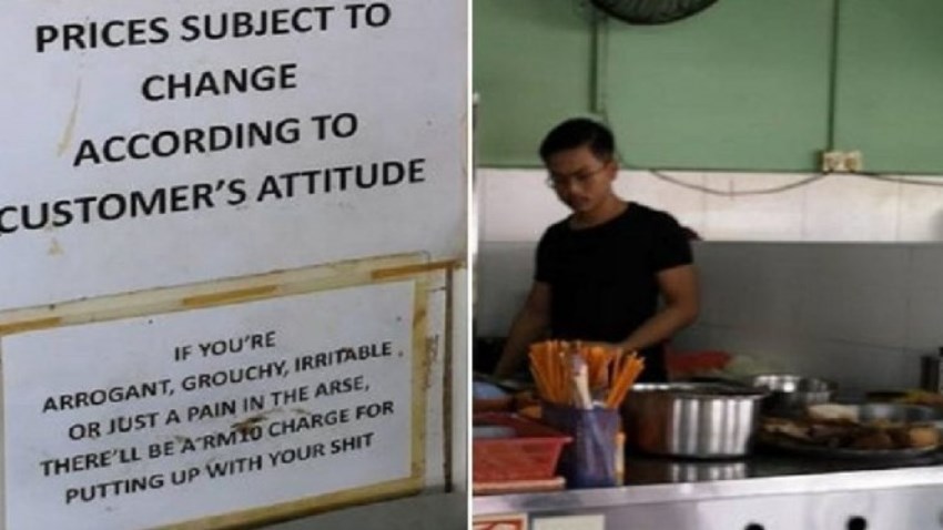 “Jika Anda arogan, suka menggerutu, mudah tersinggung atau menyebalkan akan ada biaya tambahan untuk Anda sebesar RM10”, bunyi tulisan dari salah satu poster yang dipasang di dalam restoran tersebut.