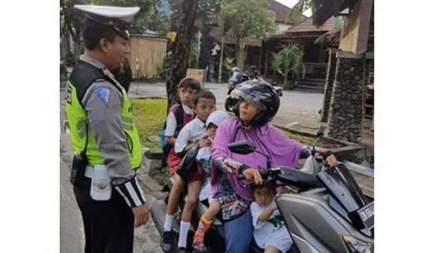 Polisi: Selamat pagi Bu, Ibu tidak boleh membonceng berlebihan seperti itu. Itu berbahaya dan melanggar peraturan lalu lintas.