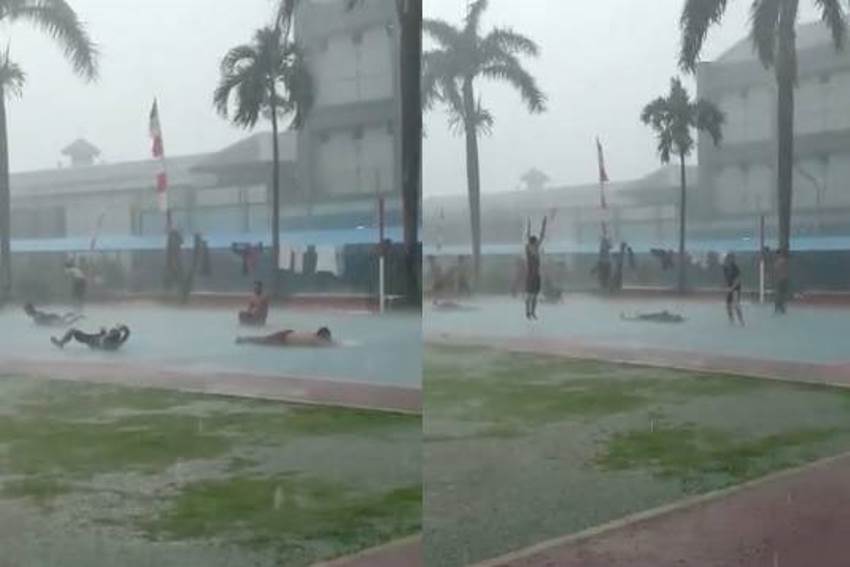Dalam video yang beredar di media sosial baru-baru ini memperlihatkan aksi sejumlah narapidana bermain hujan-hujanan di lapangan.