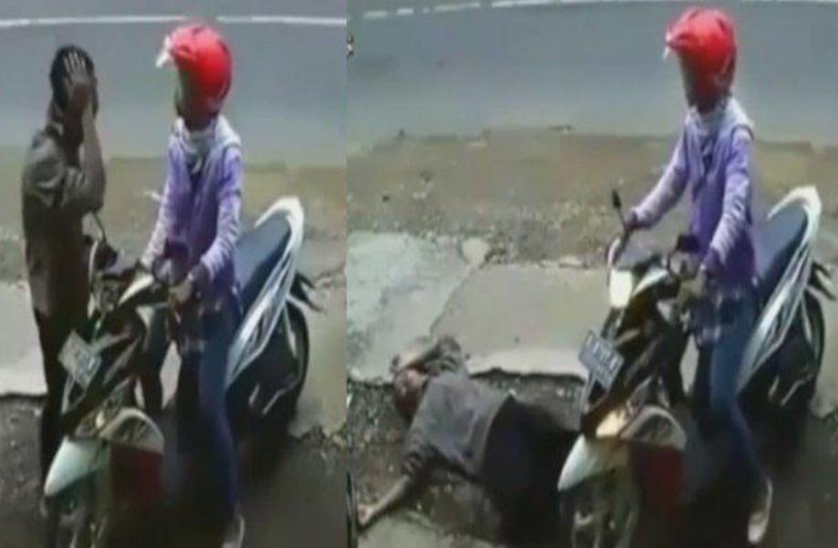 Nampak dalam video seorang pria menahan laju seorang wanita yang hendak pergi mengendarai motornya.