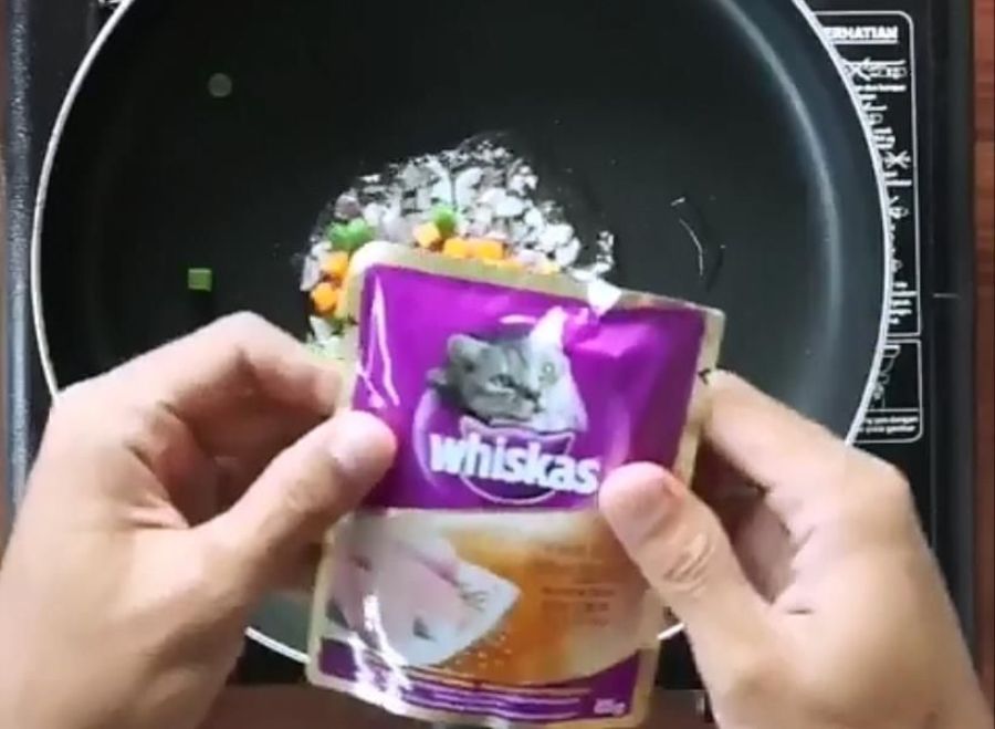 Selesai dimasak, nasi goreng campur whiskas itu disajikan dengan telur mata sapi, saus, bubuk cabe, dan tak ketinggalan kemasan makanan kucing yang diletakkan di sisi piring.